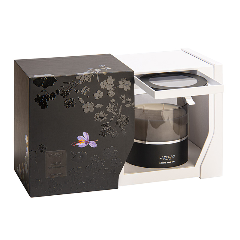 Bougie Nice To Meet You. Avec un design sophistiqué en noir et argent, cette bougie de 630 g est présentée dans un élégant verre, avec un couvercle assorti et un coffret de luxe type écrin — idéale à offrir ou à savourer chez soi. Son parfum, raffiné mais détendu, fusionne des notes épicées fraîches avec une base boisée enveloppante. Le safran se distingue comme le cœur de la composition, apportant chaleur et une touche de distinction qui harmonise toute l’expérience olfactive.